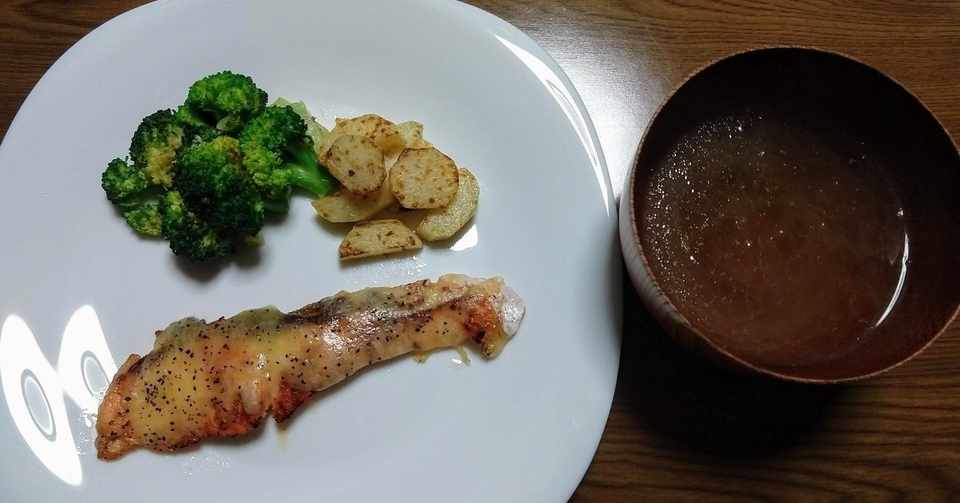 鮭のチーズ焼き ゆでブロッコリーとじゃがいものマヨネーズソテー Koji Harada Note