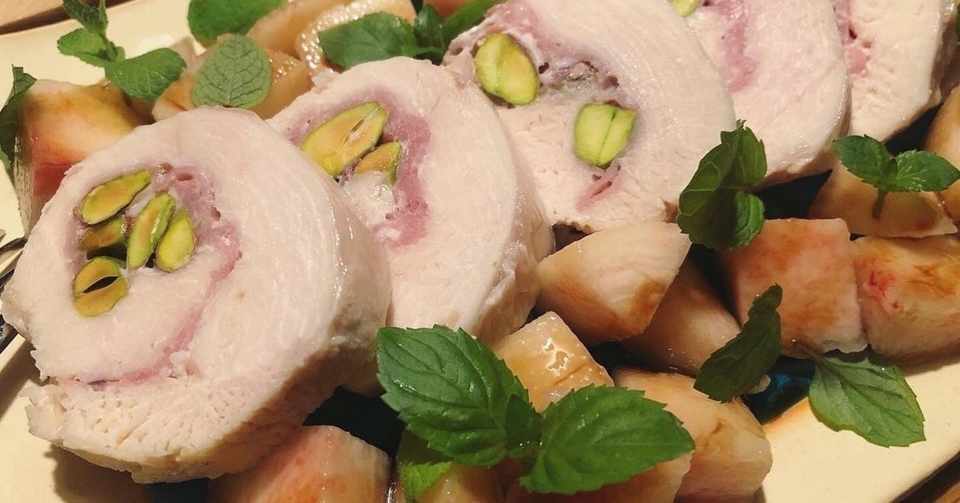 鶏胸肉のピスタチオロール 桃のバルサミコマリネ添え Sayaka Note